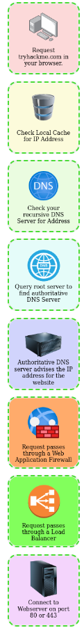 A web server is a software that listens for incoming connections and then utilises the HTTP protocol to deliver web content to its clients. The most common web server software you’ll come across is Apache, Nginx, IIS and NodeJS. A Web server delivers files from what’s called its root directory, which is defined in the software settings. For example, Nginx and Apache share the same default location of /var/www/html in Linux operating systems, and IIS uses C:\inetpub\wwwroot for the Windows operating systems. So, for example, if you requested the file http://www.example.com/picture.jpg, it would send the file /var/www/html/picture.jpg from its local hard drive.