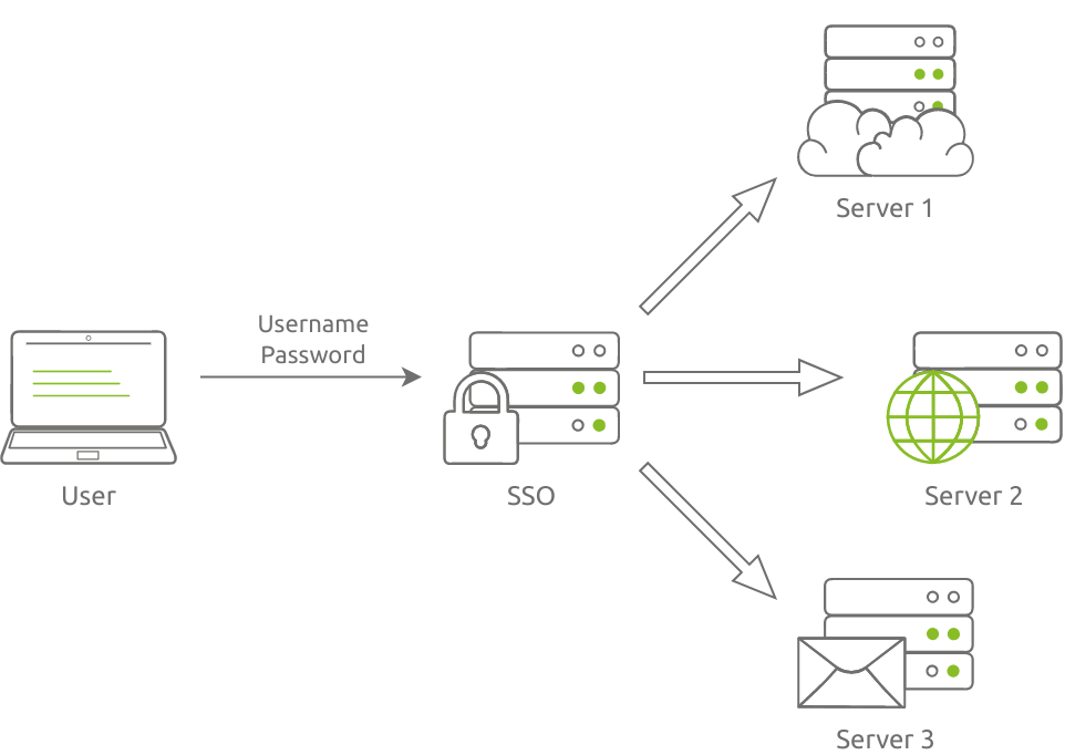 This figure shows a user authenticating using Single Sign-On (SSO) and gaining access to three servers.