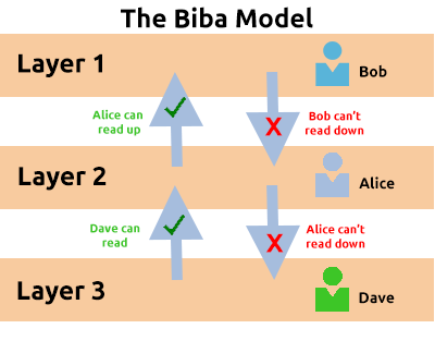This model applies the rule to objects (data) and subjects (users) that can be summarised as “no write up, no read down”. This rule means that subjects can create or write content to objects at or below their level but can only read the contents of objects above the subject’s level.